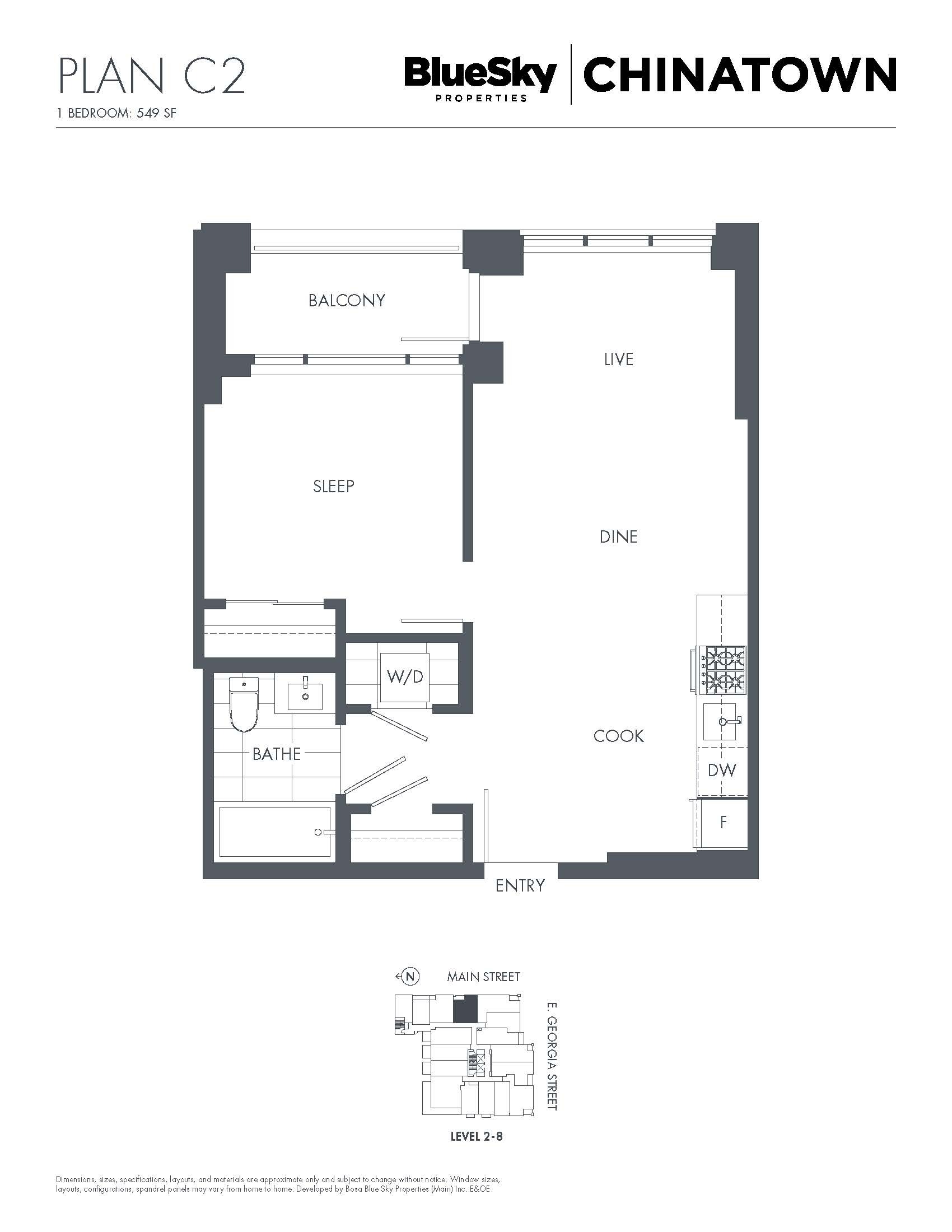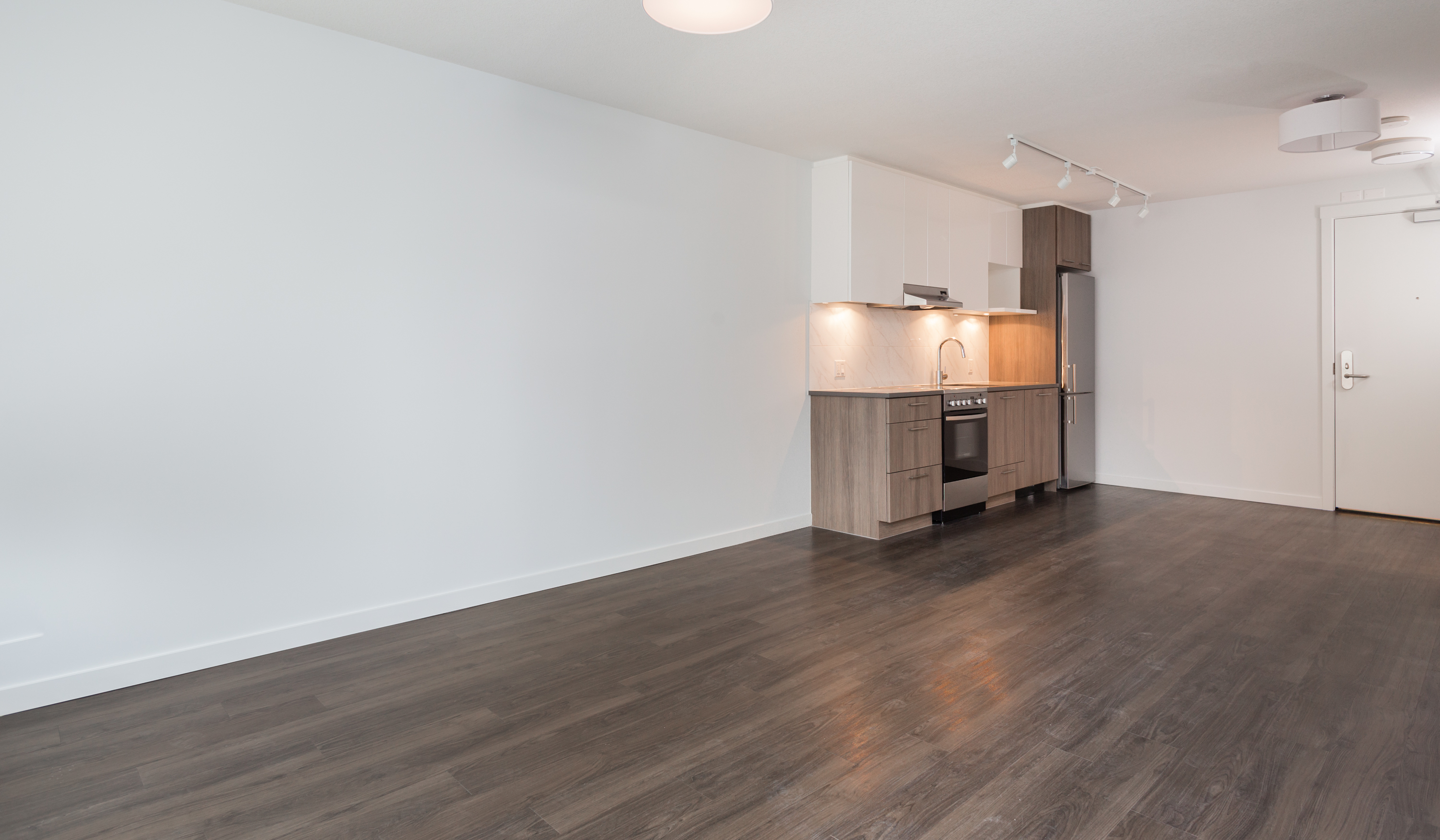 This 1BR suite faces east and features modern finishes including: stone countertops, vinyl plank floors and a full appliance package. Savour the sunrise with a morning coffee on the balcony and enjoy the people watching on the street below.