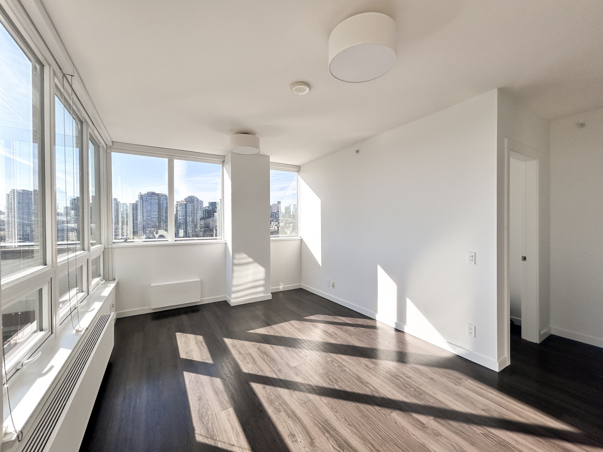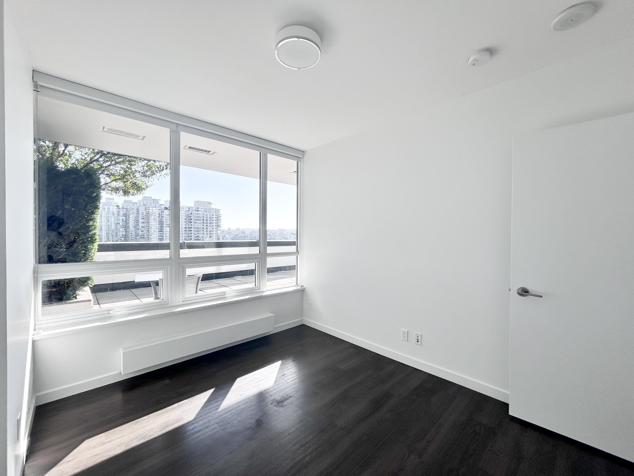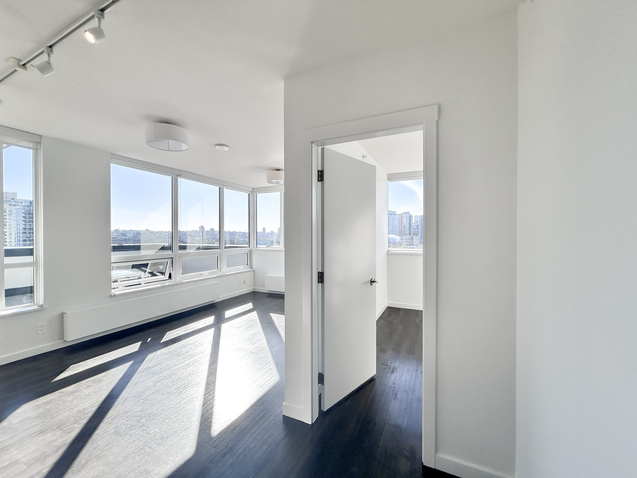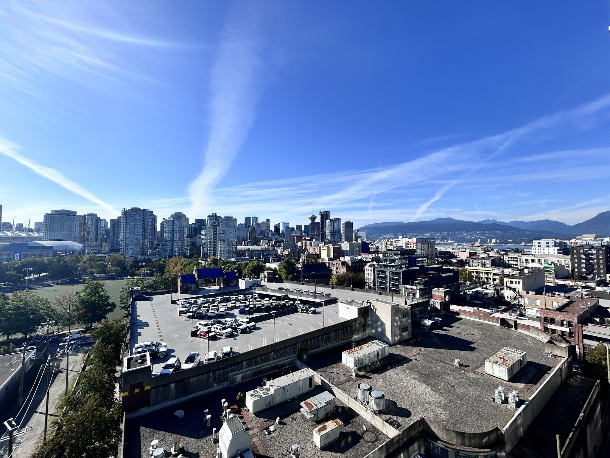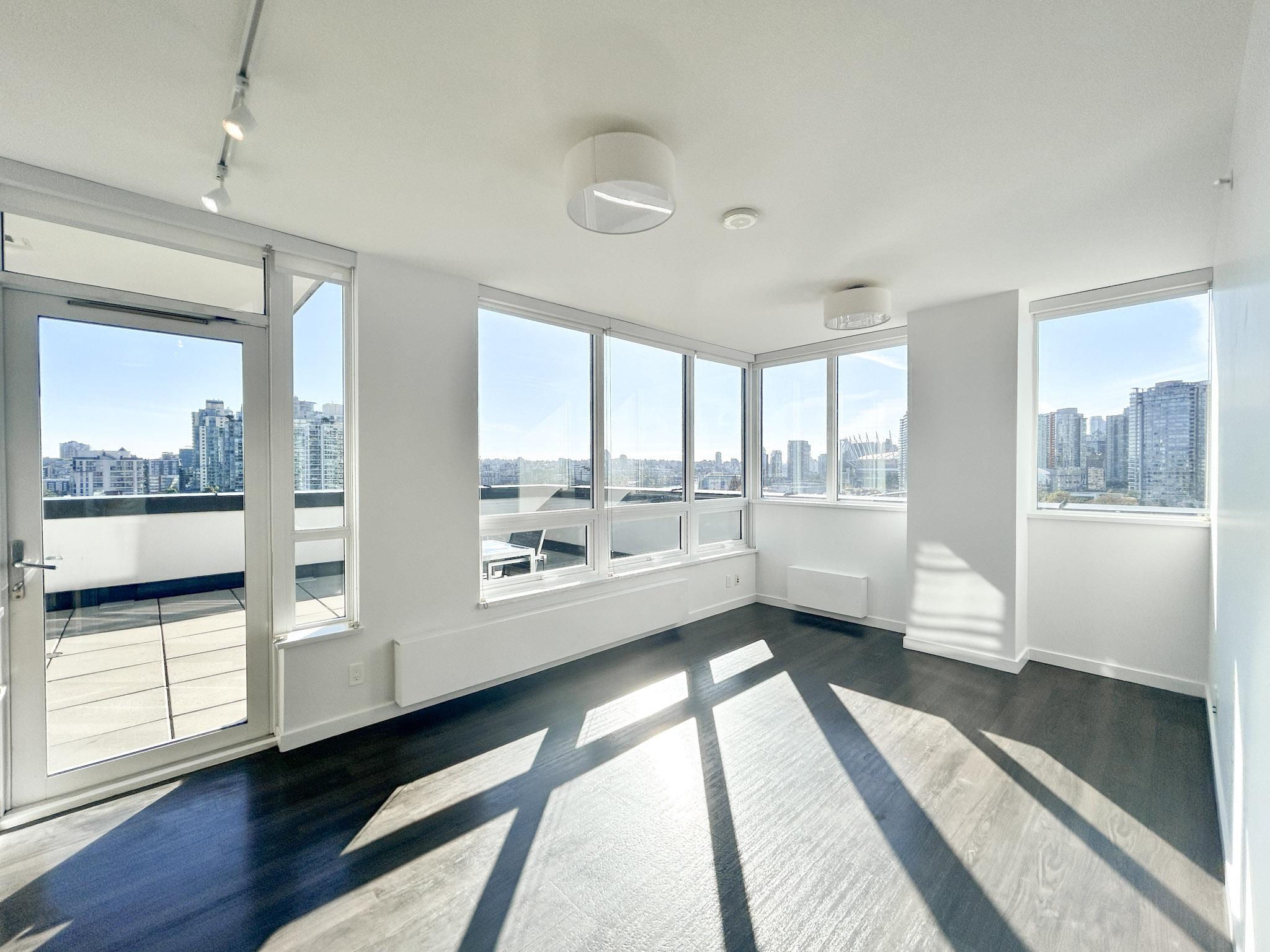 Located on the upper floors of BlueSky Chinatown, this 2BR corner suite features a bright, south-facing balcony with stunning views of False Creek and Downtown Vancouver.