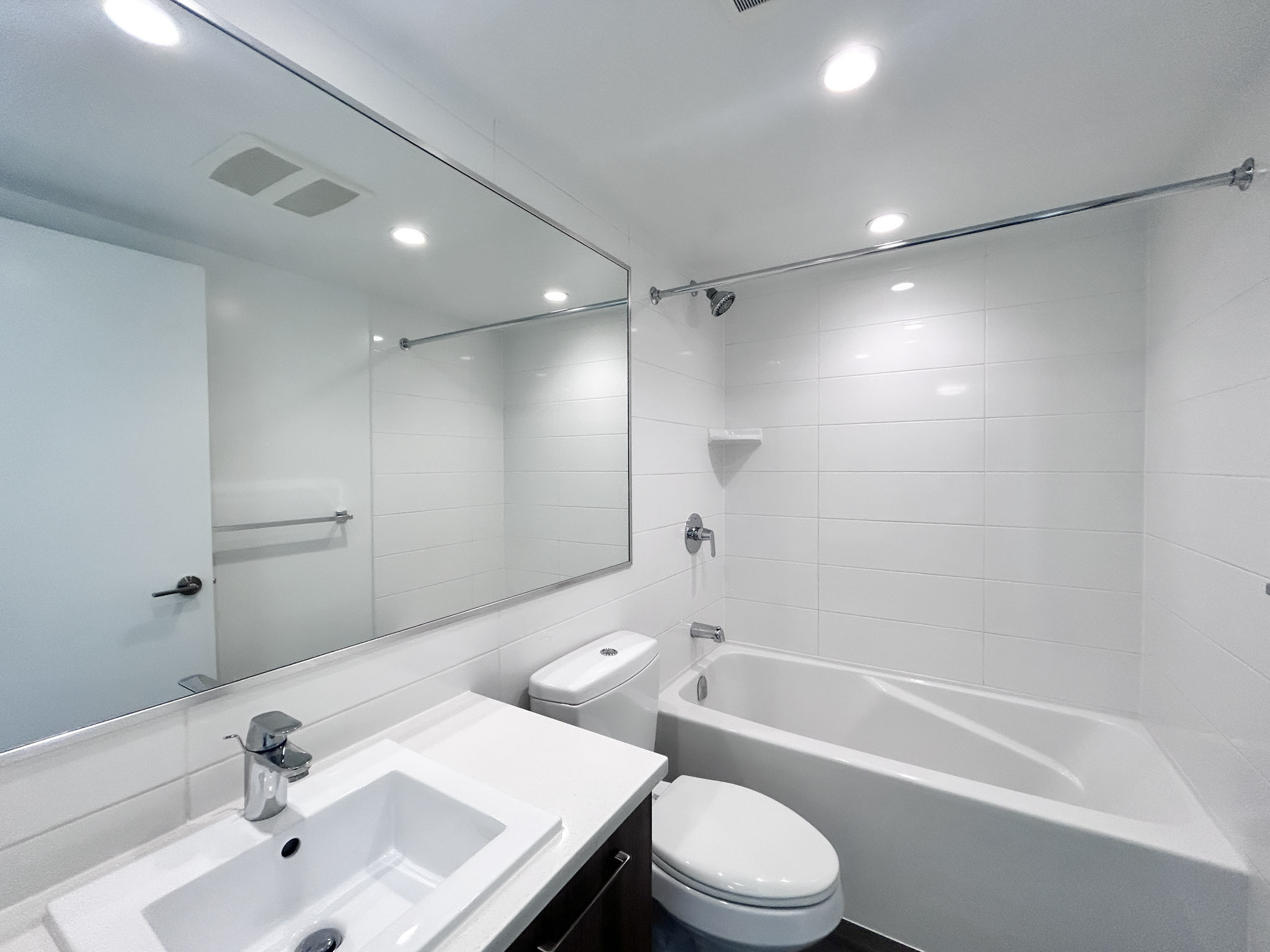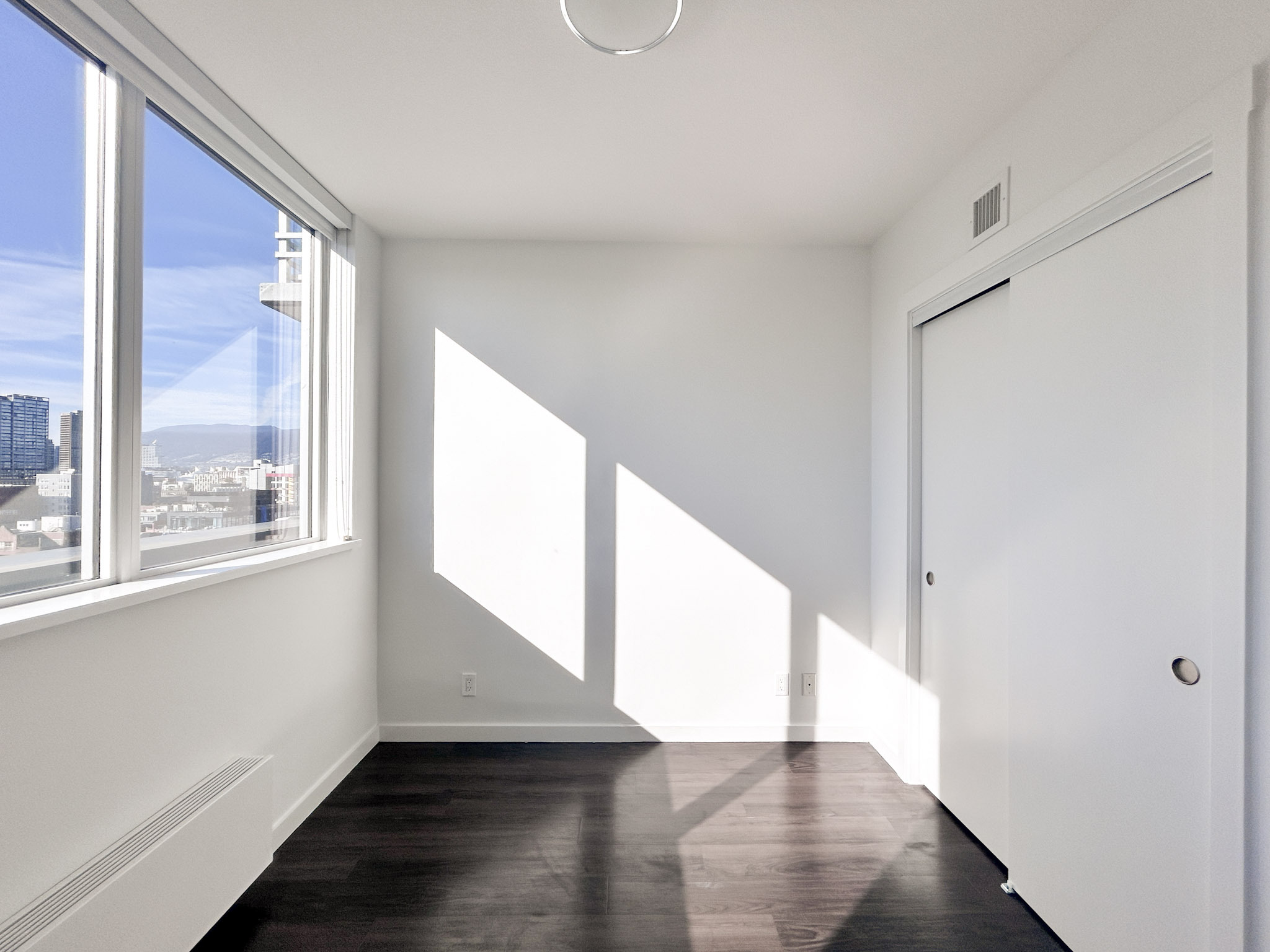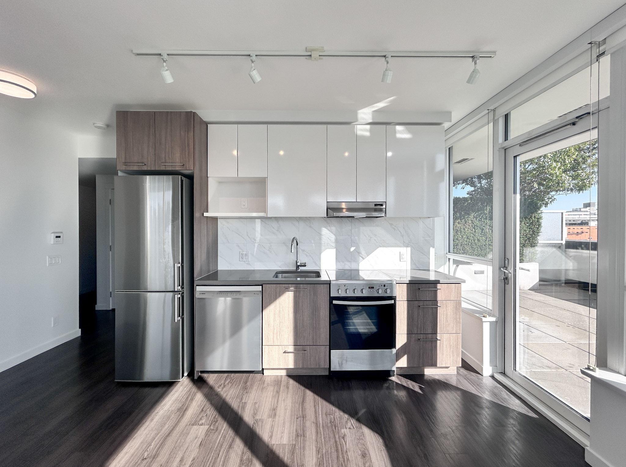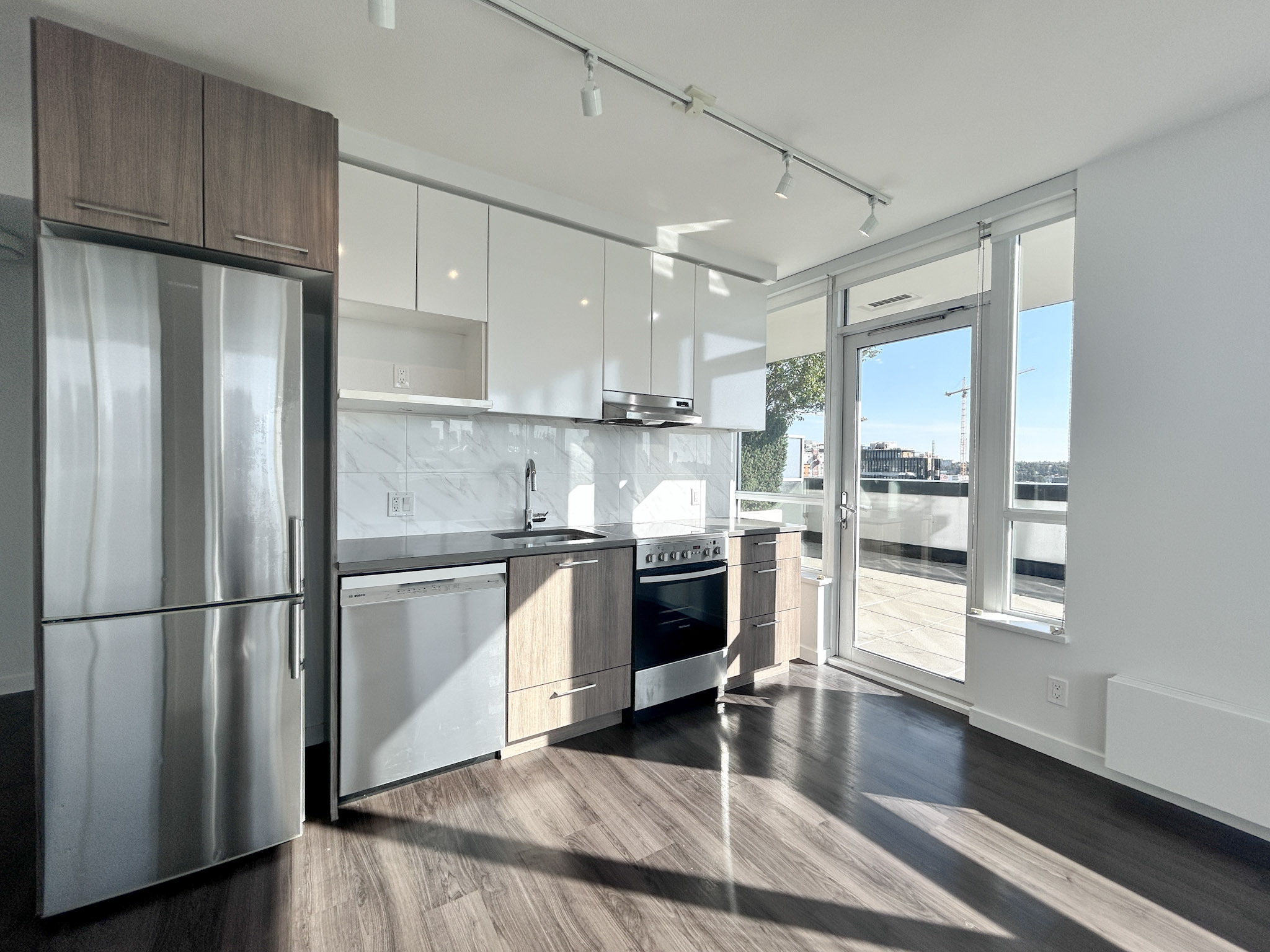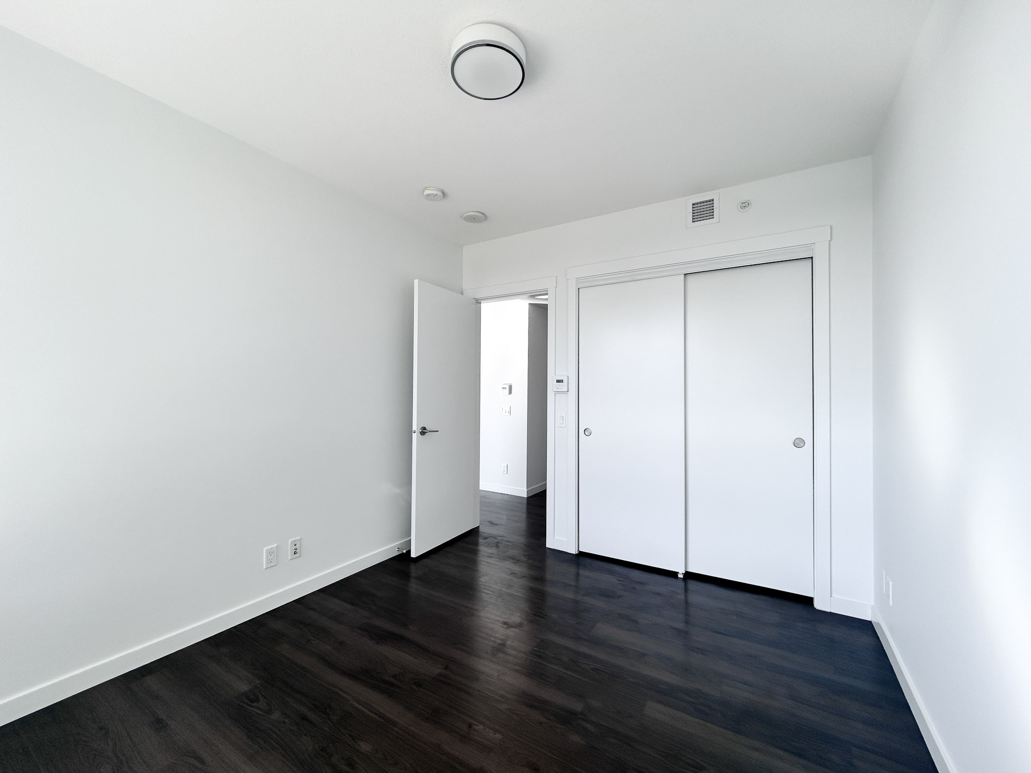 Located on the upper floors of BlueSky Chinatown, this 2BR corner suite features a bright, south-facing balcony with stunning views of False Creek and Downtown Vancouver.